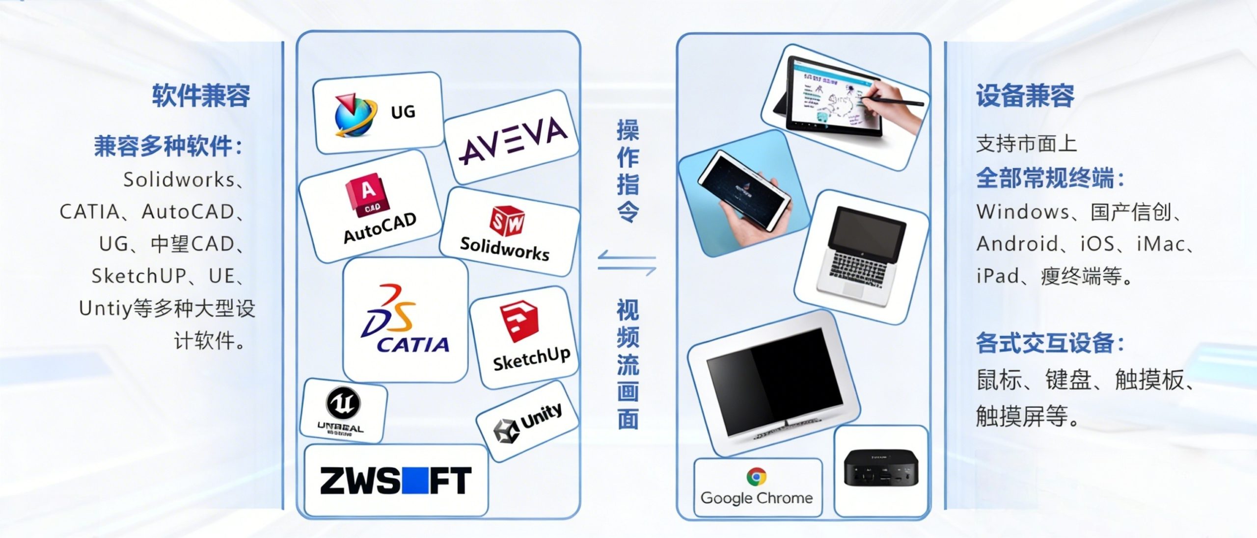 3、全向兼容,零门槛上手:兼容 Solidworks、AutoCAD、UG等主流设计软件,适配Windows、国产信创、Android等全终端系统,各类交互设备无缝衔接,设计师无需改变操作习惯。