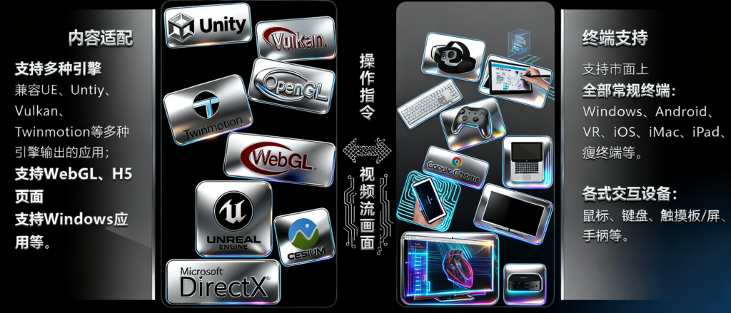 • 全终端覆盖:用户可通过Chrome等主流浏览器、手机、平板、VR/AR头显等几乎所有设备接入,无需安装专用插件或客户端,真正实现跨平台、跨终端的无缝访问。