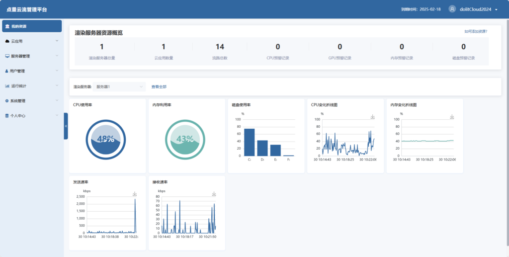 该页面中显示了渲染服务器的总体资源情况,包括服务器总量、云应用数量、流路总数、CPU预警记录、GPU预警记录、内存预警记录、磁盘预警记录等统计信息。