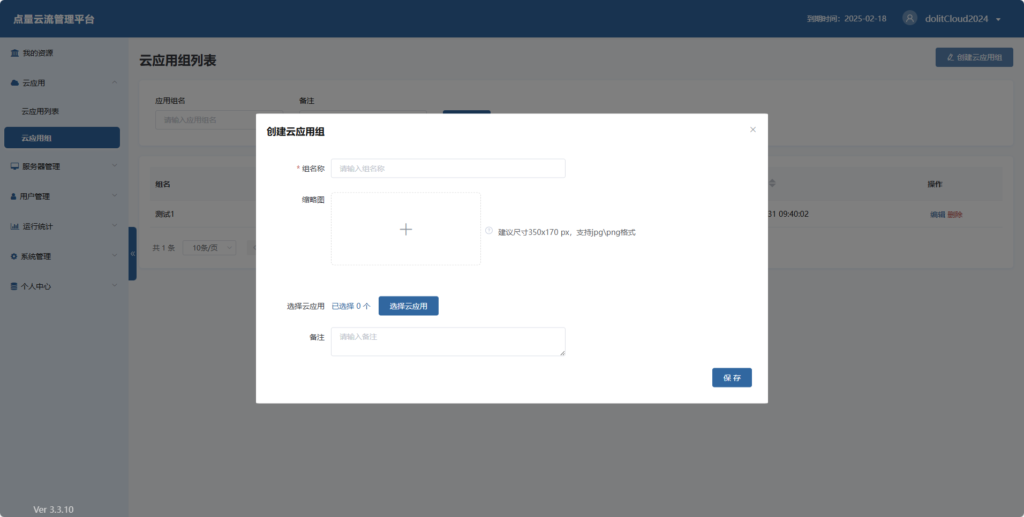 1、点击“创建云应用组”,输入组名称、备注,上传应用分组展示图(建议尺寸350×170 px,支持jpg/png格式);