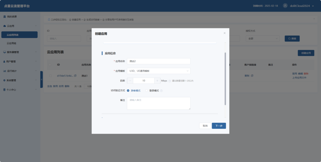 1、点击<创建应用>,填写应用名称,选择本次流化的应用类型等,选择模板之后需填写码率,选择访问验证方式。有游客模式和登录方式两种。