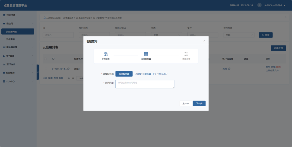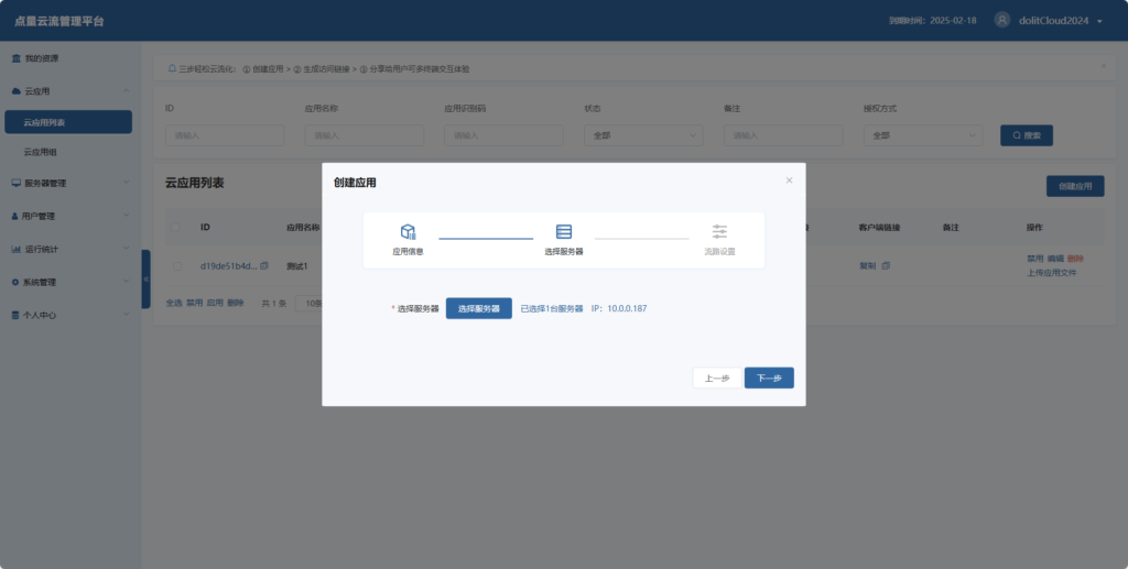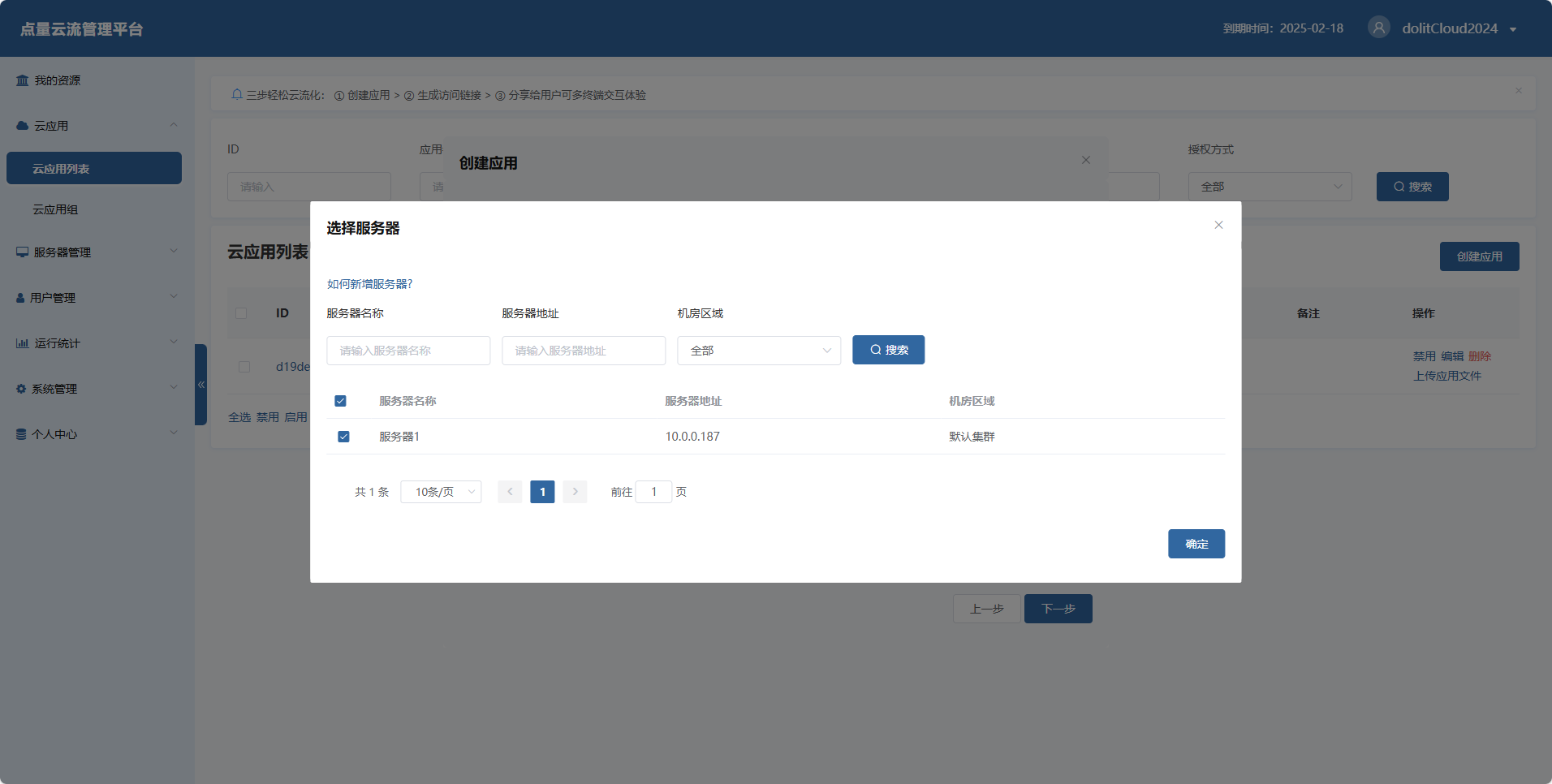 4、设置好后点击下一步,选择该应用所在服务器,支持选择多台