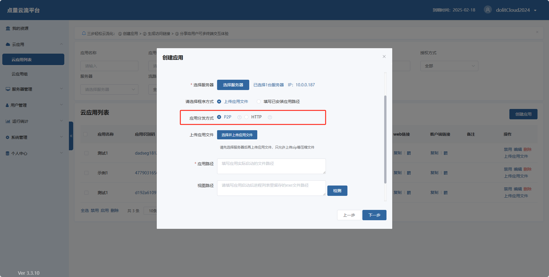 注意上传应用文件要求为ZIP格式,可选择应用的分发方式:P2P或HTTP。上传成功之后系统会自动识别应用路径和视图路径。