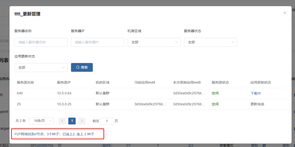 在云应用列表中,找到<更新状态>,点击下方数字,进入<更新管理>页面,显示该云应用各个服务器的应用更新状态及总体下载状态。
