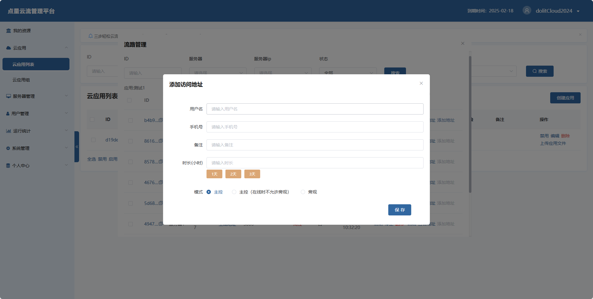 3、点击“添加地址”可对本流路添加新的访问地址,输入用户名、手机号、备注基本信息,输入时长,选择模式:主控、主控(在线时不允许旁观)、旁观(只可观看不可操作,可申请权限),设置完成之后点击“保存”即可。