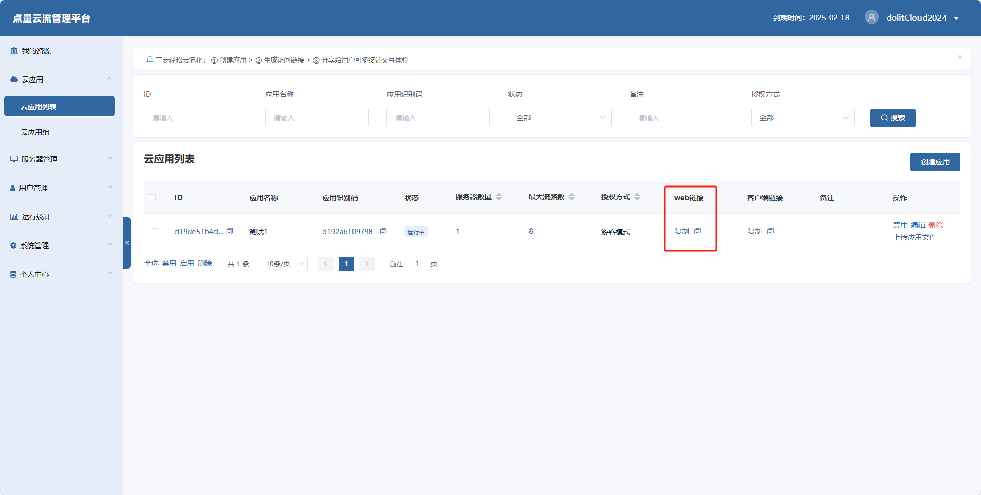 该页面中对已有云应用进行汇总,展示了名称、状态、服务器数量等信息。支持通过应用ID、应用名称等字段对云应用进行搜索,用户可以对云应用进行禁用、编辑等操作。